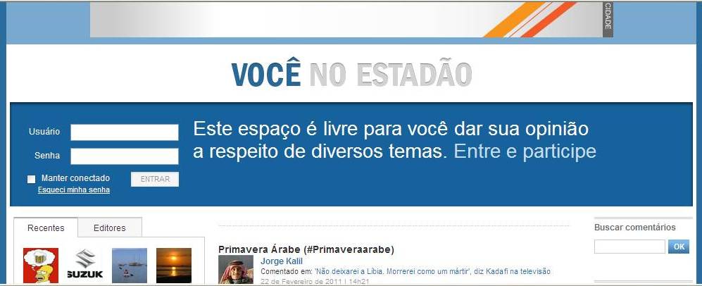 O Estadão permite que o leitor tenha contato direto com o processo jornalístico. A ferramenta “você no estadão” proporciona liberdade para o leitor opinar sobre vários temas.